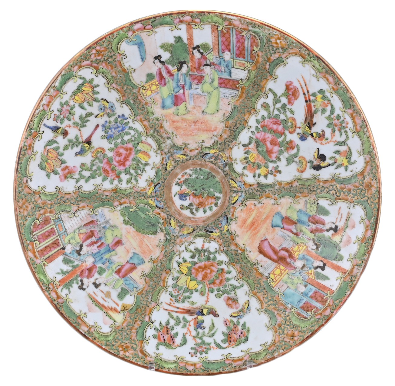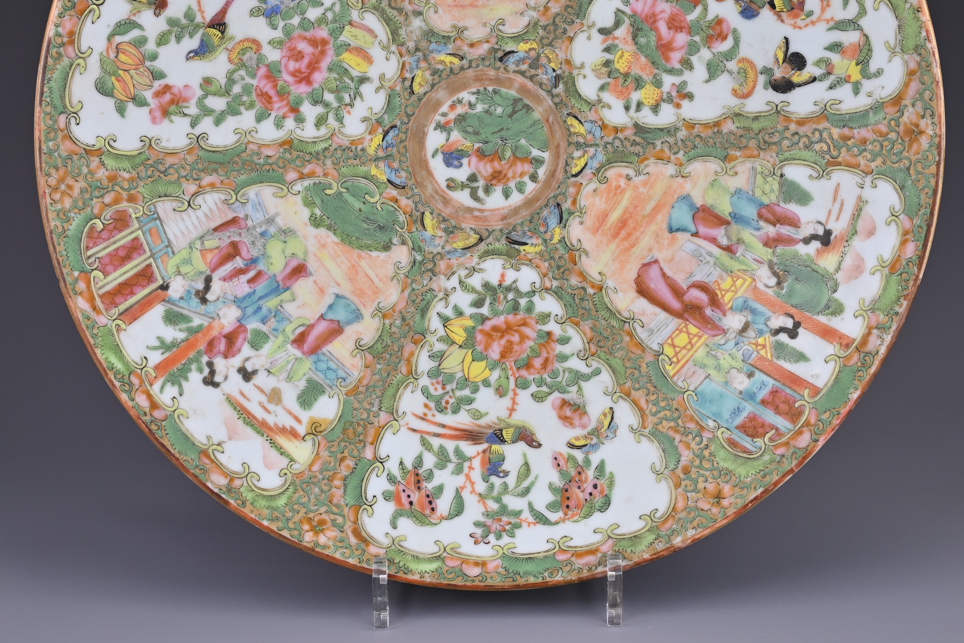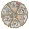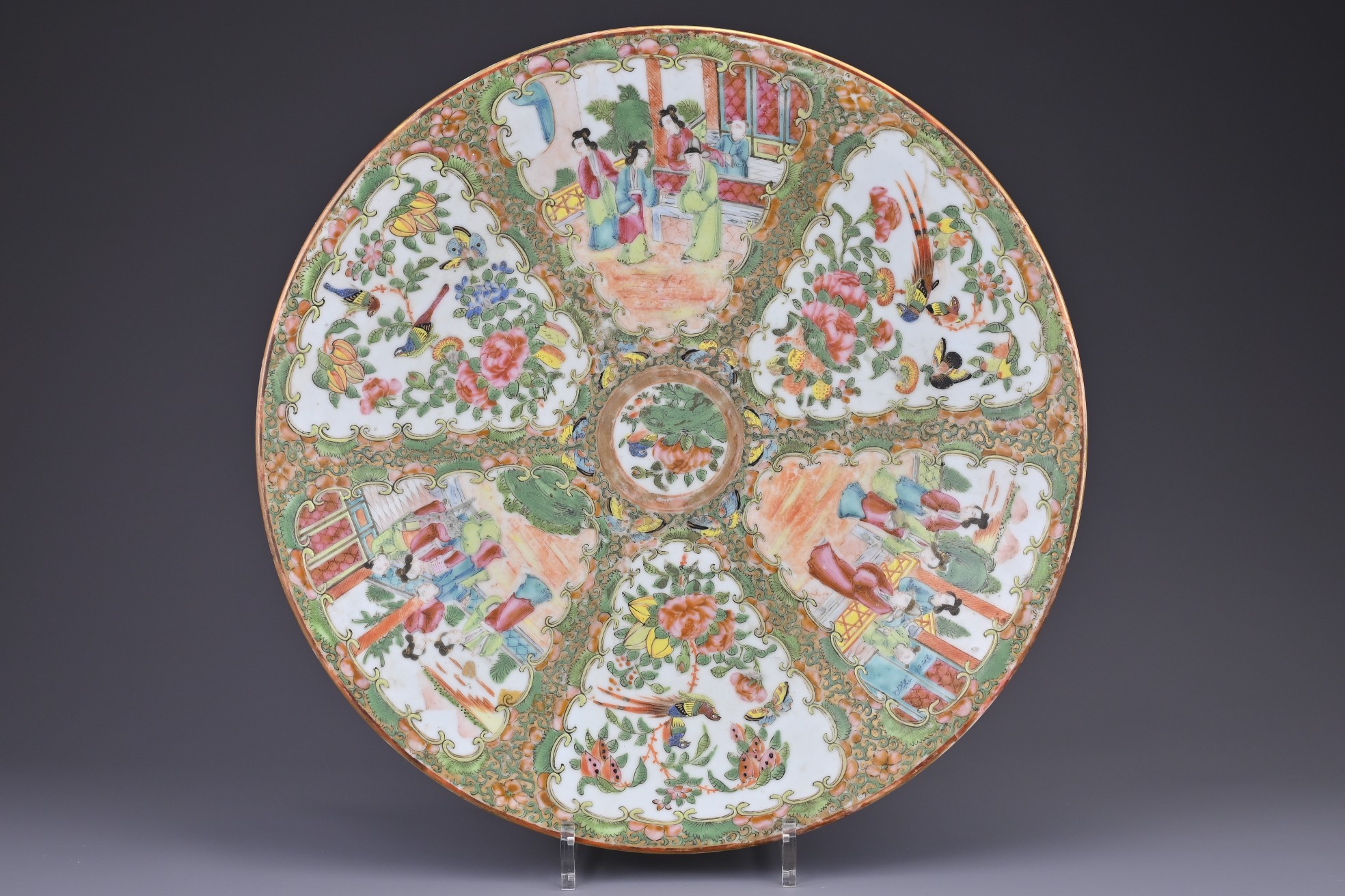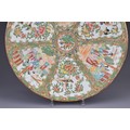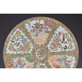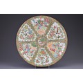 A LARGE CHINESE CANTON FAMILLE ROSE PORCELAIN CHARGER, 19TH CENTURY. Decorated in the rose medallion pattern with figures in shaped cartouches. 37.5cm diam.