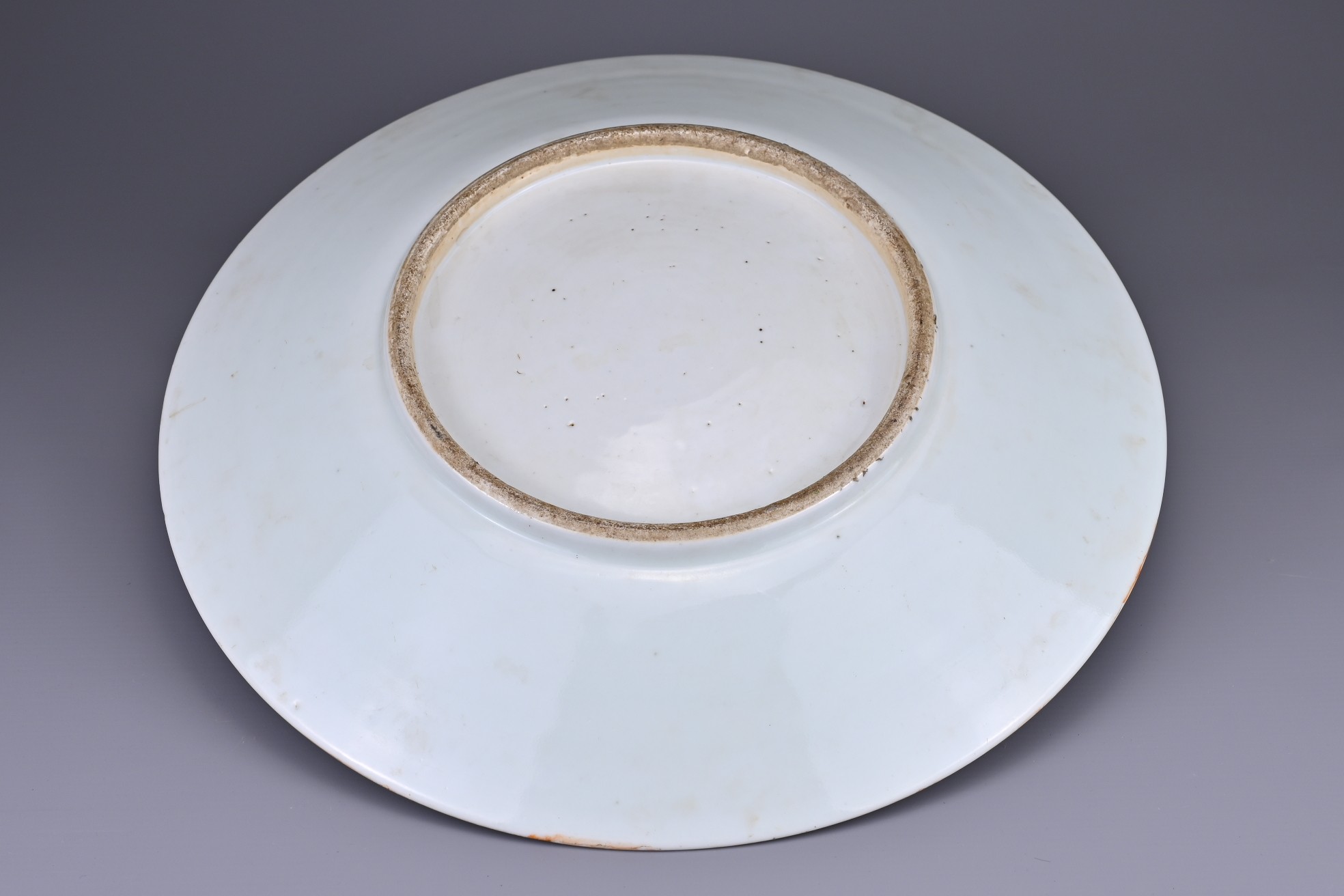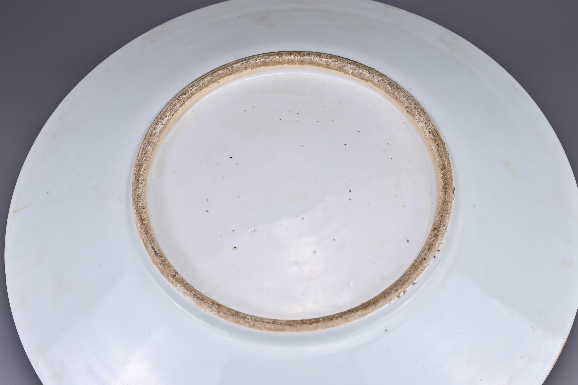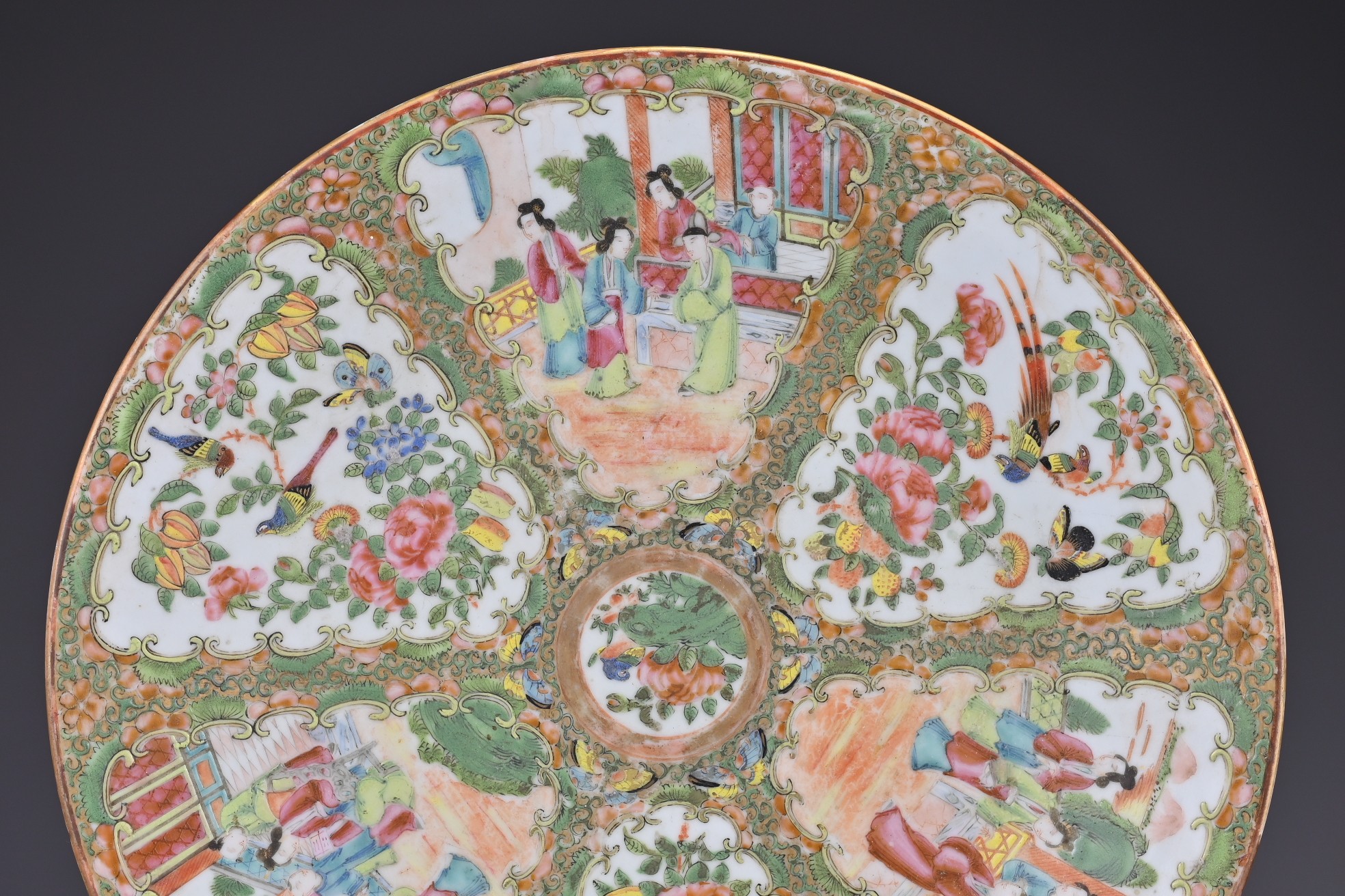 A LARGE CHINESE CANTON FAMILLE ROSE PORCELAIN CHARGER, 19TH CENTURY. Decorated in the rose medallion pattern with figures in shaped cartouches. 37.5cm diam.